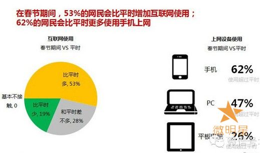 春节期间53%的网民比平时增加互联网的使用,超过6成网民的手机上网行为将比平时更多: